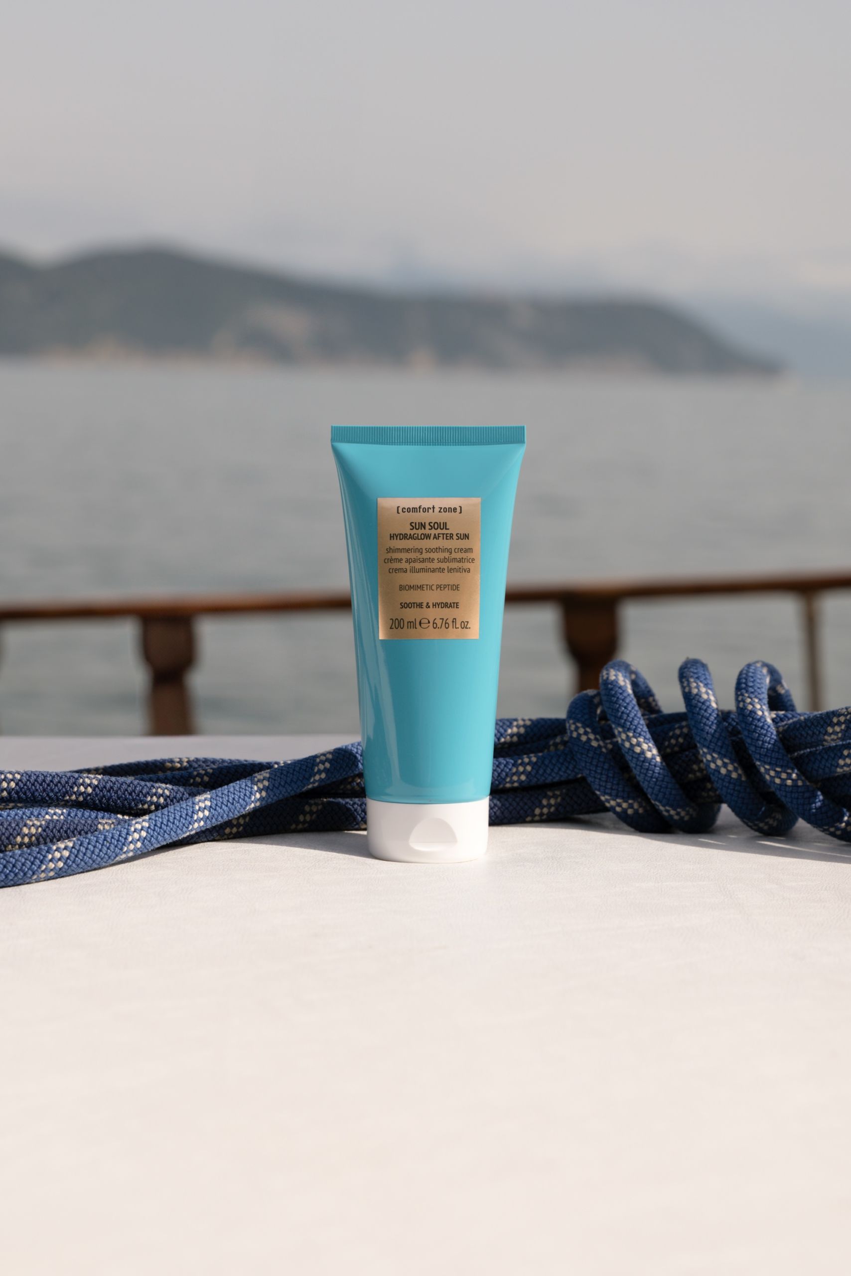 Verwöhne deine Haut nach einem sonnigen Tag mit der SUN SOUL Face & Body After Sun von [comfort zone] – einer leichten, schnell einziehenden Pflege, die Feuchtigkeit spendet, beruhigt und gleichzeitig die Hautalterung bekämpft.